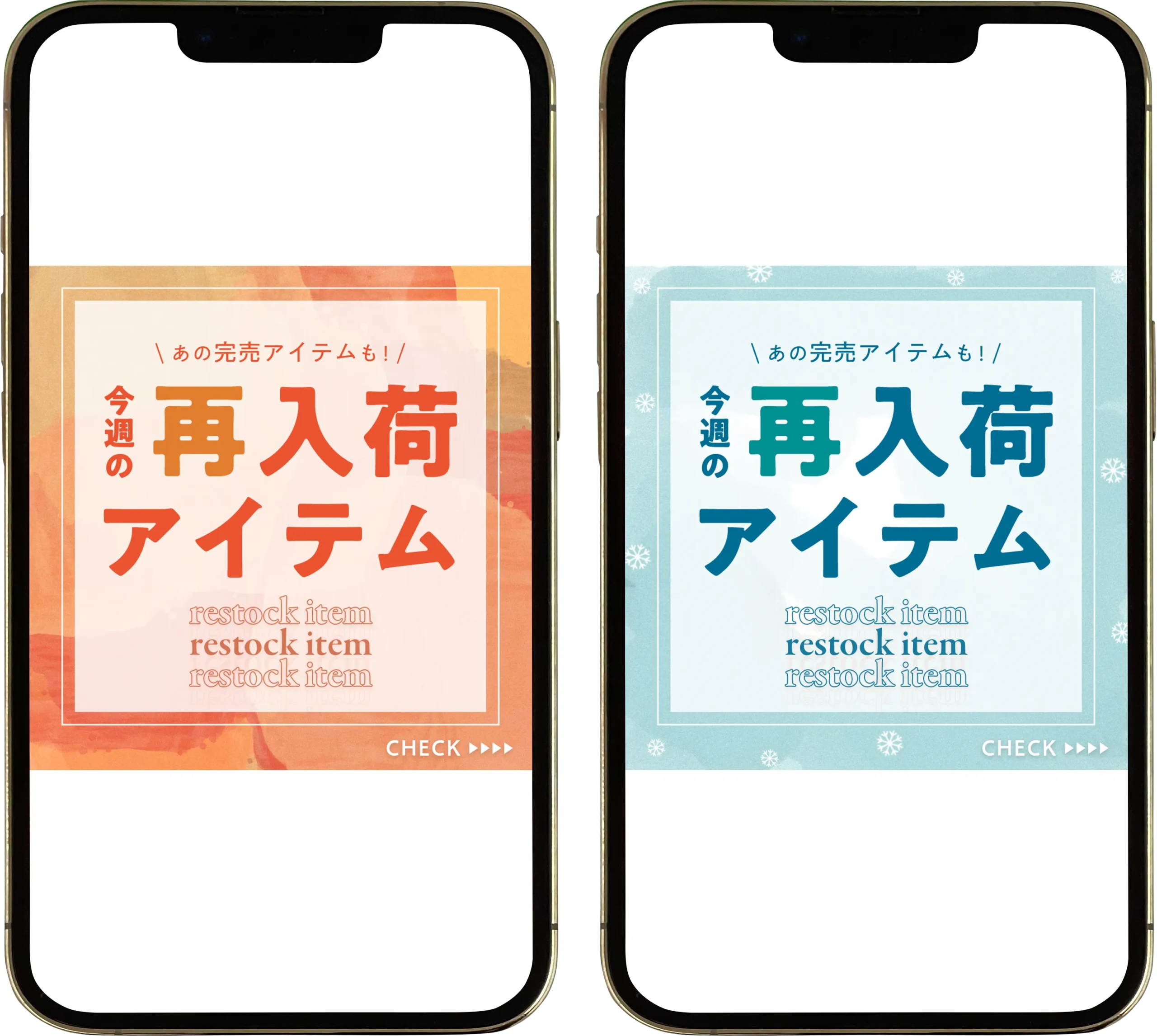 - 再入荷という訴求がひと目で伝わるよう、情報や装飾は最小限に抑え、テキストの可読性を重視